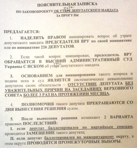 "Относительно инициативы Партии регионов. В этой пояснительной записке они предлагают нам гениальное решение, чтобы их карманный административный суд лишал мандатов депутатов", - сказал он.