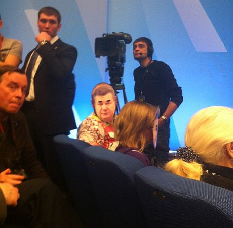 Активисты движения "Стоп цензуре" на пресс-конференции президента одели маски с лицом Виктора Януковича.
