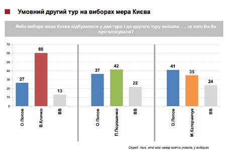 Если бы выборы мэра Киева проходили в два тура и во второй тур вышли бы Александр Попов и Виталий Кличко, то 26,5% тех, кто намерен голосовать, поддержали бы действующего руководителя города, 60,4% - лидера партии УДАР, 13,1% - не определились.