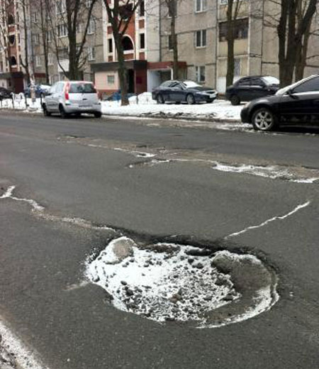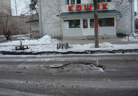 | Яма на улице Российской в Дарницком районе 19 марта. Фото с сайта УкрЯма |