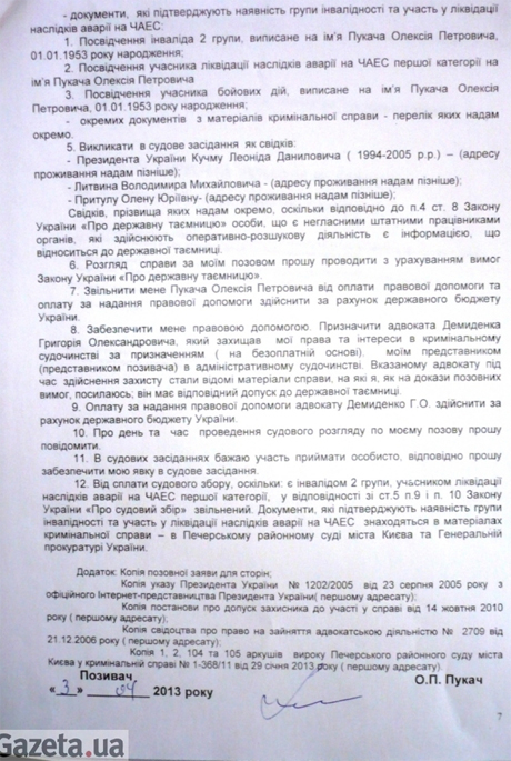 На судебное заседание в качестве свидетелей Пукач требует вызвать бывшего президента Леонида Кучму, Владимира Литвина и Елену Притула. Фамилии других свидетелей не называет, ссылаясь на государственную тайну.