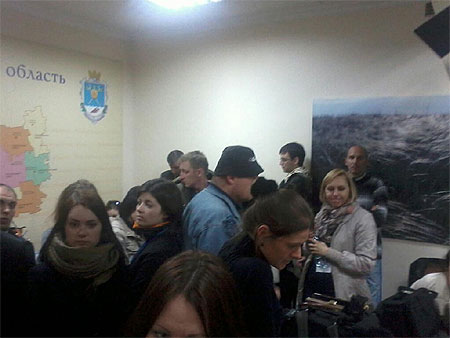 "Журналистов из двух групп согнали в пресс-центр из холла ОГА. Ждем пока пройдет Янукович по холлу. Тут тесно и душно", - написал в Twitter Volodymyr Silaykov