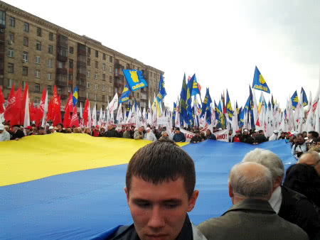 Оппозиционеры уже успели развернуть большой государственный флаг, который должны нести впереди.