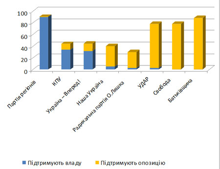Партия регионов - 90% опрошенных, Коммунистическая партия - 34% опрошенных (лишь 10% считают эту партию оппозиционной), партия Королевской "Украина - вперед!" - 32% опрошенных (но 13% считают ее оппозиционной).