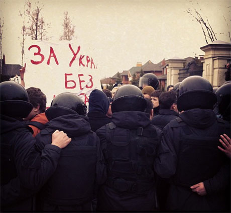 Неизвестные в черном пытаются оттеснить активистов ДемАльянса от ворот Межигорья.