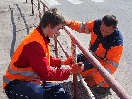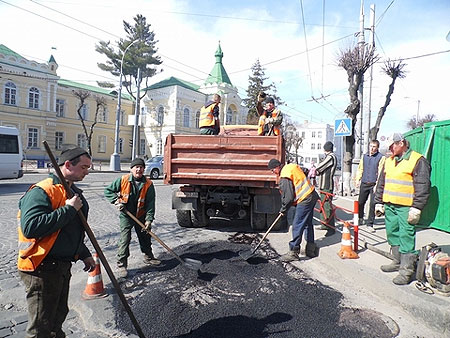 Рабочие горслужб красят ограждения, стригут дерева, латают ямы на дорогах.