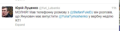 Экс-министр внутренних дел Юрий Луценко не ведет Твиттер и не прогнозировал освобождения Тимошенко.