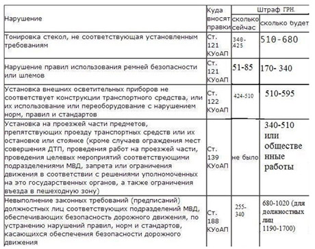 Законопроект вынесли на обсуждение до 1 июня 2013 года, и если он получит развитие, больше всего поднимут размер штрафа из-за не пристегнутого ремня безопасности: с 51-85 гривен до 170-340 гривен, а также за "невыполнение требований должностных лиц МВД" - до 1700 гривен.