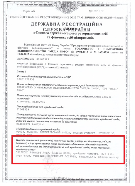 "Каждый может получить выдержку из государственного реестра, где указаны учредители ООО "Медиаинфо"... Участниками "Медиаинфо" является компания "Уилкокс" с вкладом в 50 грн. И компания "Балмор" с вкладом в 950 грн", - написал он.