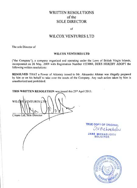 Кроме того, адвокат директора компании "Вилкокс", которая опосредовано владеет ТВi, Андреас Софоклеос заявил, что Ортодоксия Никия не выдавала никаких доверенностей Александру Альтману.