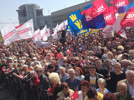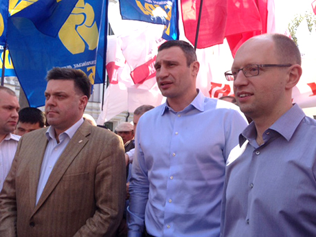 В митинге принимают участие председатель фракции "Батькивщина" Арсений Яценюк, "УДАР" Виталий Кличко и ВО "Свобода" Олег Тягнибок, народные депутаты от оппозиции.