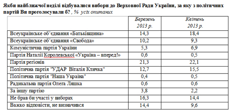 По сравнению с началом марта выросла доля тех, кто намерен проголосовать за "Батькивщину", "УДАР" и за КПУ.