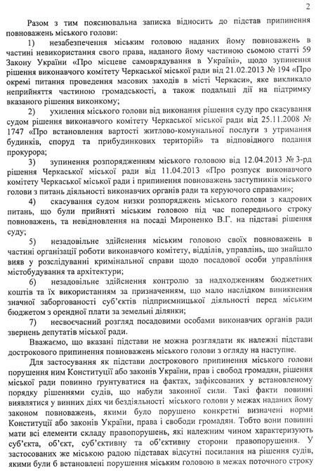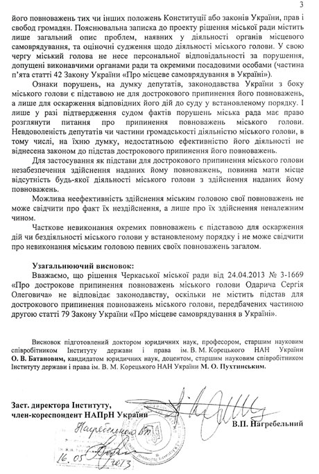 "Считаем, что решение Черкасского горсовета от 24 апреля 2013 года о досрочном прекращении полномочий городского главы Одарича Сергея Олеговича не отвечает законодательству, поскольку не содержит оснований для досрочного прекращения полномочий городского главы, предусмотренных частью 2 статьи 79 закона о местном самоуправлении", - сказано в выводе.