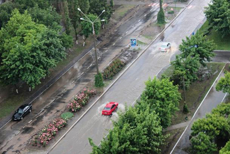 Одной из самых проблемных улиц после дождя стала ул.Строителей: вода здесь стекала большим потоком и собиралась в нижней точке улицы. Ливневая канализация не справлялась с потоками воды во дворах домов в каждом микрорайоне.