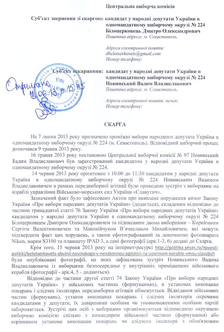 Как известно, раньше Белоцерковец направил жалобу в ЦИК и просил признать действия кандидата в депутаты Новинского не отвечающими требованиям закона о выборах депутатов.