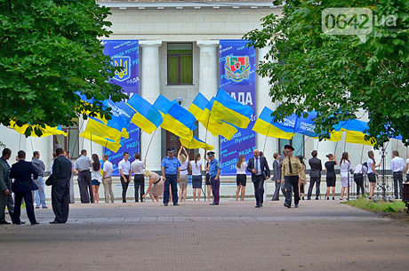 Напротив второго здания Луганской ОГА собрались молодые люди с флагами Партии регионов.