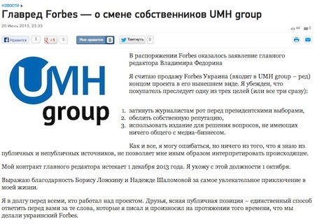 Издание публикует заявление главного редактора Forbes Украина Владимира Федорина. "Я считаю продажу Forbes Украина (входит в UMH group – ред) концом проекта в его нынешнем виде. Я убежден, что покупатель преследует одну из трех целей (или все три сразу)