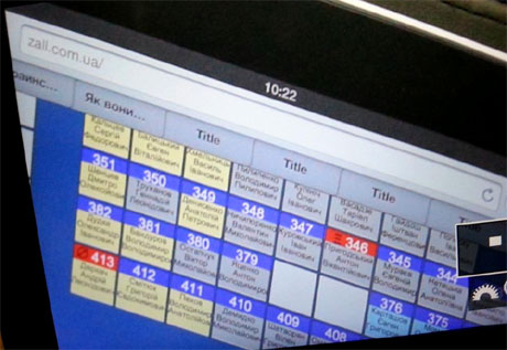 Раньше фотокор газеты Коммерсант Влад Содель в своему Facebook обнародовал фото, как депутат от ПР Александр Егоров на своем планшете через сайт zall.com.ua контролировал присутствие нардепов ПР ради успешных голосований.