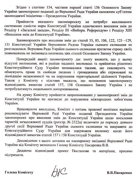 Вместе с тем позже Писаренко сообщил "Украинской правде", что после десяти вечера завершилось заседание профильного комитета, где при необходимом кворуме было принято решение поддержать предложенные изменения в Конституцию.