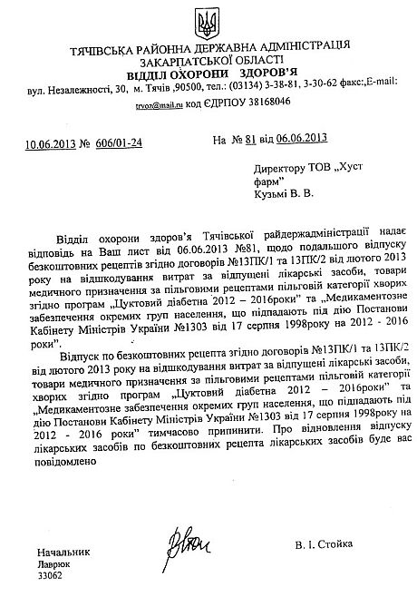 "Из этого письма следует, что Тячевская РГА прекращает действие постановления Кабинета Министров о бесплатном обеспечении льготных категорий, в частности диабетиков, медикаментами", - говорится в материале.