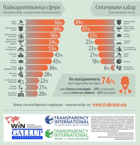 Наиболее коррумпированными украинцы назвали именно те институты, которые призваны бороться с коррупцией - суды (66%), правоохранительные органы (64%), государственную службу (56%), сферу здравоохранения (54%), парламент (53%), политические партии (45%) , образовательную систему (43%), бизнес (36%), военную сферу (28%), СМИ (22%), религиозные институты (21%), общественные организации (20%).
