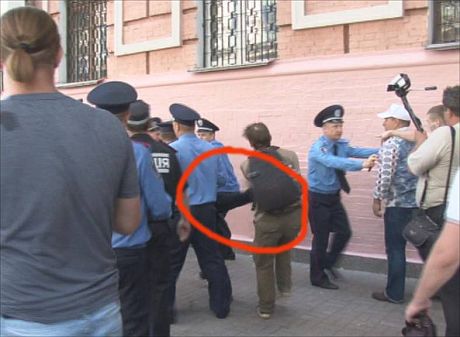 Как известно, ранее сообщалось, что Барабаш был среди пострадавших на акции 18 мая. На фото четко видно, как фотографа бьет ногой неизвестный.