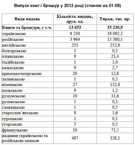 За первое полугодие 2013 года общий тираж изданных на украинском языке книг и брошюр составил 14 миллионов 319 тысяч экземпляров (50,07% от общего количества, которое составляет 28 миллионов 598 тысяч), а на русском – 12 миллионов 983 тысячи экземпляров (45,40%).