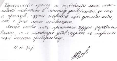"В которой нынешний руководитель Госагентства просит прощения за организованную в общежитии пьянку, берет на себя смелость просить возможность реабилитировать себя и навсегда обязуется не чернить честь университета. Вот такие они - "политические убеждения" оранжево-бело-голубого Каськива", - заключает он.