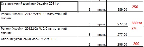 Кругленькую сумму библиотеки заплатили за статистическую литературу – "Статистический сборник Украины 2011" и "Регионы Украины 2012 в 2 частях". Приобрели по 5 экземпляров каждой и заплатили 4715 гривен.