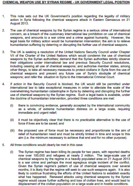 Документ попал в прессу в преддверии парламентских дебатов о возможности нанесения военных ударов по целям в Сирии. По мнению британского правительства, он призван продемонстрировать легальность и необходимость таких ударов, пишет Лента.ру.