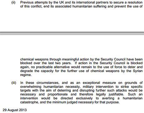 В документах подчеркивается, что Лондон неоднократно пытался доказать правоту своей позиции в Совете безопасности ООН, но его доводы не были услышаны, поэтому единственной альтернативой остается "принятие исключительных мер для снижения масштабов гуманитарной катастрофы в Сирии и подрыв возможностей сирийского режима по использованию химического оружия".