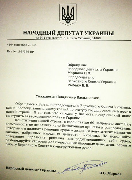 Игорь Марков, которого судом лишили депутатского мандата, призывает спикера Владимира Рыбака не выполнять решение суда.