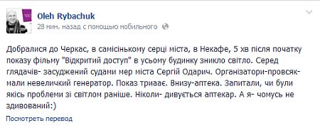 "В Черкассах на 5-й минуте показа альманаха Открытый доступ первой серии Межигорье погас свет! Но организаторы оказались готовыми к такому сюрпризу - подсоединили генератор - смотрим!" - рассказала она.