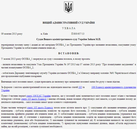 По сообщению Высшего админсуда, 9 октября были проверены "исковые заявления гражданина N и гражданина D" о признании незаконным и отмене указа президента № 197/2013 от 7 апреля "О помиловании осужденных" в части помиловании Юрия Луценко и его доставки в Менскую колонию №91 для дальнейшего отбывания наказания.