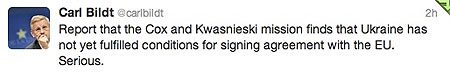 В свою очередь глава МИД Швеции Карл Бильдт написал в своем Twitter: "Доклад миссии Кокса-Квасьневского свидетельствует о том, что Украина еще не выполнила все условия для подписания соглашения об ассоциации с ЕС".