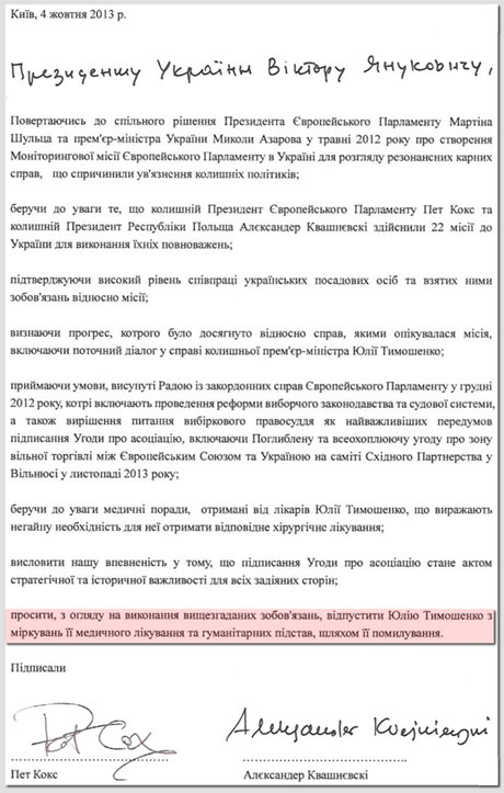 Он отметил, что согласно тексту обращения, оно является "фактически ультиматумом: подписание Соглашения об ассоциации напрямую зависит от того, какое Виктор Янукович примет решение по освобождению Тимошенко".