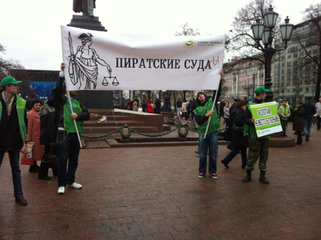 Участники акции держали плакаты с участницами Pussy Riot, Михаила Ходорковского, с момента ареста которого недавно исполнилось 10 лет, и Лебедева, сообщает "Новая газета".