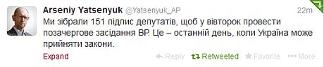Сообщение об этом появилось в твиттере Арсения Яценюка.