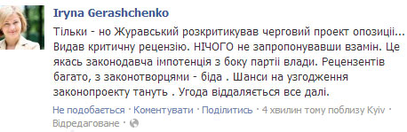 "Только что Журавский раскритиковал очередной проект оппозиции... Выдал критическую рецензию. НИЧЕГО не предложив взамен", - написала Геращенко.