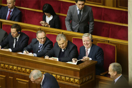 Кроме того, он сообщил, что на заседании присутствуют представители миссии Европейского парламента экс-президент Польши Александр Квасьнвский и экс-президент ЕП Пэт Кокс.