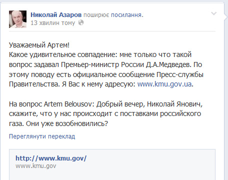 "Какое удивительное совпадение: мне только что такой вопрос задавал премьер-министр России Д.А.Медведев. По этому поводу есть официальное сообщение пресс-службы правительства. Я Вас к нему адресую: www.kmu.gov.ua.