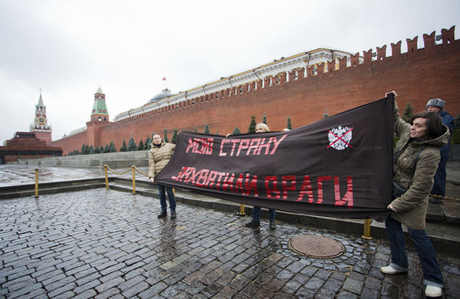На Красной площади в Москве восемь активистов развернули три баннера, после чего были задержаны полицией.
