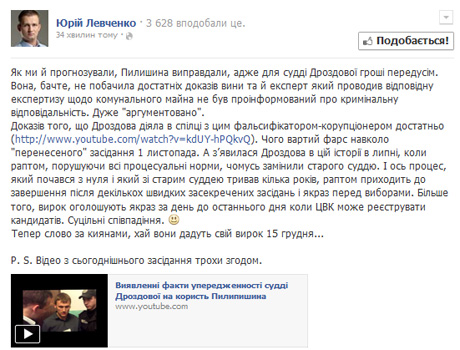 "Как мы и прогнозировали, Пилишина оправдали, ведь для судьи Дроздовой деньги прежде всего", - пишет он.