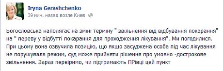 "При этом она (Богословская) озвучила позицию, что если осужденный во время лечения не нарушал режим, суд может принять решение об условно-досрочном освобождении. Сейчас проверим, поддержат ПРивци этот пункт или нет", - рассказала Геращенко, но о результатах не сообщила.