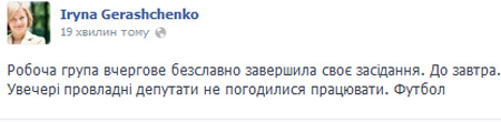 "Вечером провластные депутаты не согласились работать. Футбол", - написала она.