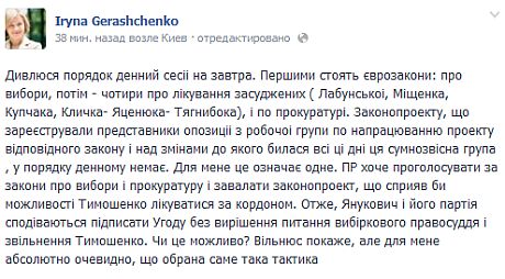 "Смотрю повестку дня сессии на завтра. Первыми стоят еврозаконы: о выборах, потом - четыре о лечении осужденных (Лабунськой, Мищенко, Купчака, Кличко-Яценюка-Тягнибока), и по прокуратуре", - написала она на своей Facebook-странице.