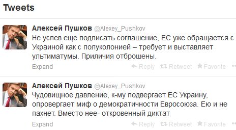 "Не успев еще подписать соглашение, ЕС уже обращается с Украиной как с полуколонией – требует и выставляет ультиматумы. Приличия отброшены", - отметил он.