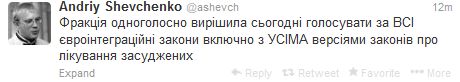 "Фракция единогласно решила сегодня голосовать за ВСЕ евроинтеграционные законы включая ВСЕ версии законов о лечении осужденных", - сообщил Шевченко.