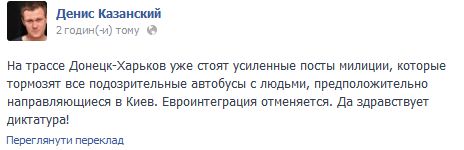 "На трассе Донецк-Харьков уже стоят усиленные посты милиции, которые тормозят все подозрительные автобусы с людьми, предположительно направляющиеся в Киев. Евроинтеграция отменяется. Да здравствует диктатура!", - отметил он.