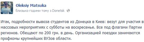 "Итак, подробности вывоза студентов из Донецка в Киев: везут для участия в массовых мероприятиях с субботы на воскресенье. Все под флагами Партии регионов. Обещают по 200 гривен в день. Организацией поездки занимаются профкомы крупнейших ВУЗов области", - уточнил он.